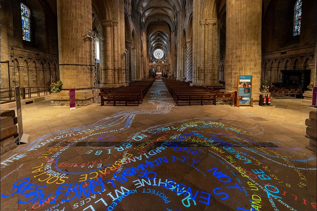 As part of its summer exhibition, Durham Cathedral has created a powerful light-based artwork called The Words That Bind Us, which takes centre stage in its nave. Commissioned for the exhibition, the immersive installation by visual artist Nicola Anthony transforms the space into a river of light and language. Projected text, drawn from the Magna Cartas in the cathedral collection and crowdsourced from local communities, shimmers across the floor, shifting and rippling as visitors move through it. The result is an ever-shifting experience that invites reflection on justice, democracy, and the values that bind us
