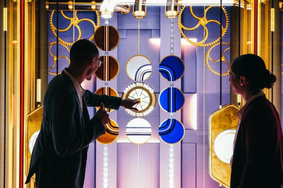 The journey unfolds in two stages. In the first room, guests participate in a collaborative pre-show game across three interactive LED walls, where they’re invited to repair the Perpetual Story Machine’s broken mechanisms to safeguard its treasured stories from being lost. Once the problem is solved, the doors open to reveal the centre of the magical device: a 360° immersive core. Guests journey through three distinct stories, travelling across different eras and regions of America, encountering first-person accounts inspired by true events. To keep things fresh, each story immerses visitors in a unique environment with a distinct aesthetic.