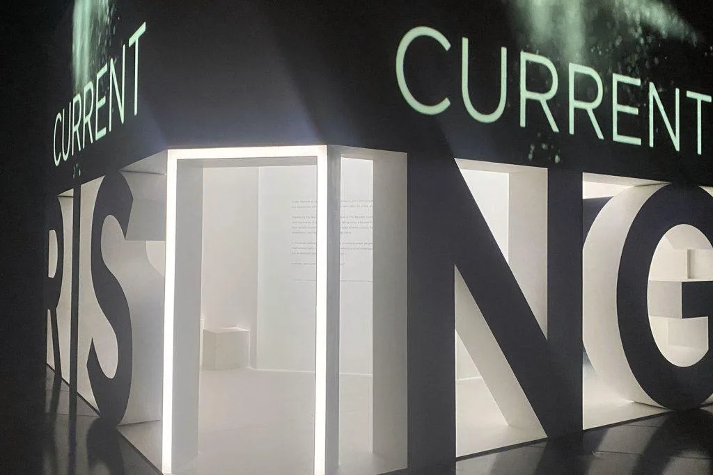Actually, the cross the threshold moments keep coming. We walk down circular stairs, with each pass we have a view of the words ‘CURRENT RISING’ emblazoned in 3D form below. It’s a good use of anticipation, as we go deeper. At the centre of CURRENT RISING is another threshold: a glowing white rectangle of a doorway.