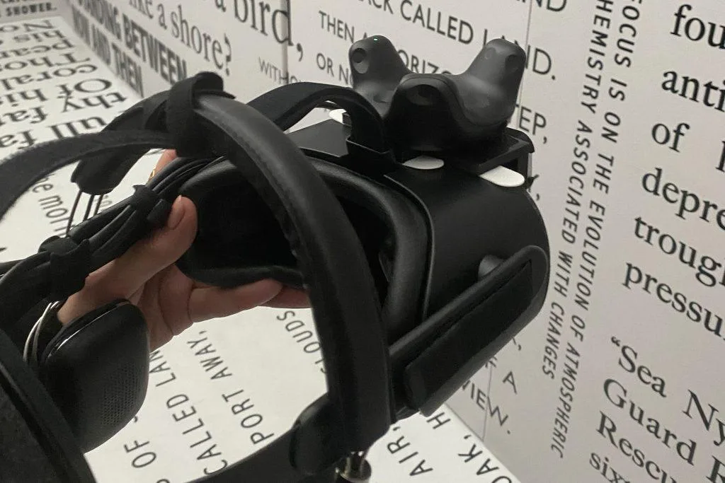 Now we cross another threshold through a door that, again, is a glowing white rectangle. Inside, another ante-chamber, of sorts. Words in different sizes — fragments of what may be poetry, shipping forecasts, quotes, news — cover the walls. We try our kit, take it off, try it again. It’s very thoughtfully managed. We are told to do what would be normal in real life — so no you’re not allowed to walk through walls or step into the abyss — and that when a doorway appears, we should go through it.