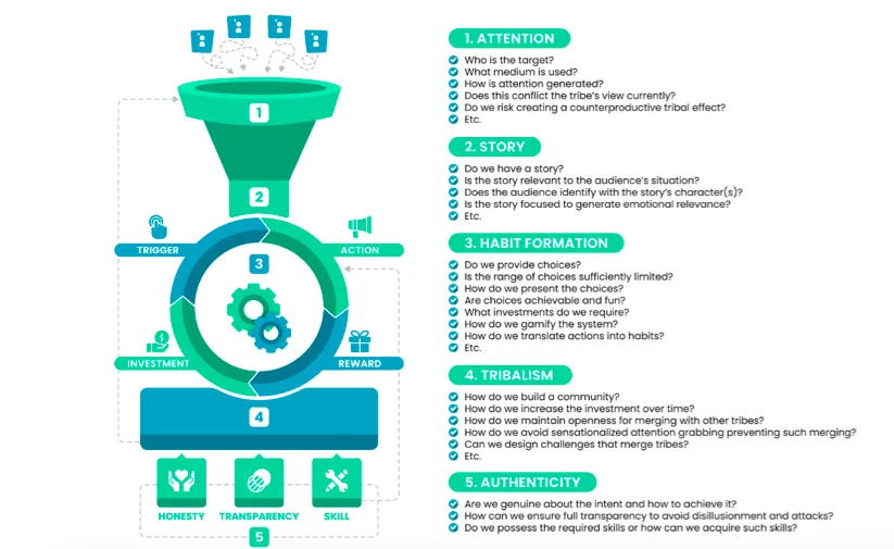 Also, have we provided an initial reward easing an investment due to reciprocation of the audience? Do we fully understand the outcome of the choices provided, and have we ensured that the choice is not leading to an adverse outcome? Can we incentivize co-creation for example? Can we get a public commitment? Gamification techniques with emphasis on variable rewards need to be integrated to maintain momentum.