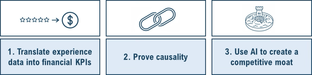 In the experience economy, this “Time well-spent” model is paramount, as you are effectively charging for the time customers spend with you. Here, the financial link is simple: a better experience means people spend more time, generating more revenue. However, most businesses still operate in the “time well-saved” world, where the link must be proven with hard data. This requires moving beyond correlations to establish quantifiable financial connections.
