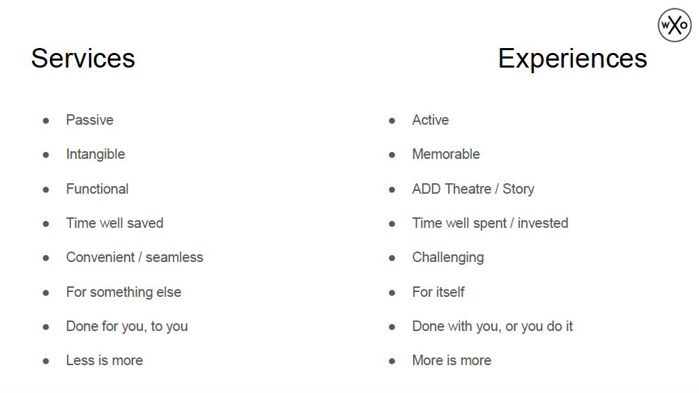Whether you agree with the criteria that James presented or with the take-downs that Claus shared, it’s clear that there is a distinction between services and experiences – but also that there’s a spectrum between them where they blend into each other.