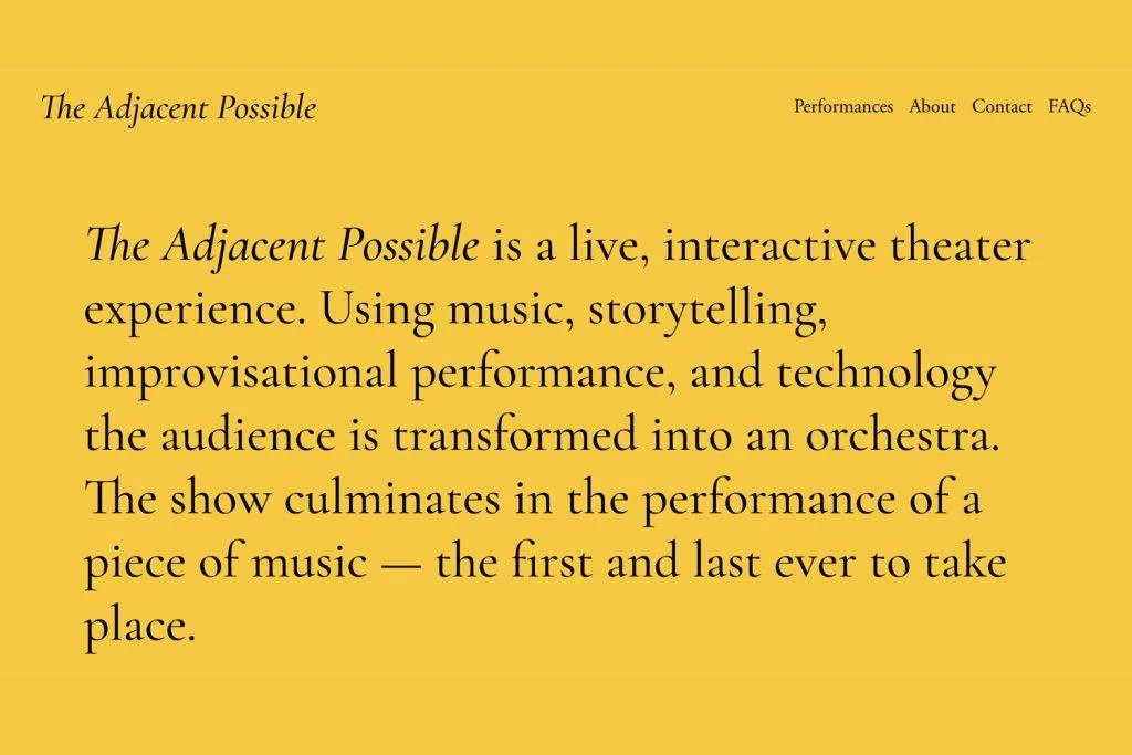 The Adjacent Possible will eventually offer more insight. The production first began as an in-person experience and then, after just two performances, closed due to the pandemic. Rather than forcing the show’s in-person framework into a digital space, its creators integrated the limitations the pandemic presented and utilized those limitations to create psychological safety through anonymous intimacy.